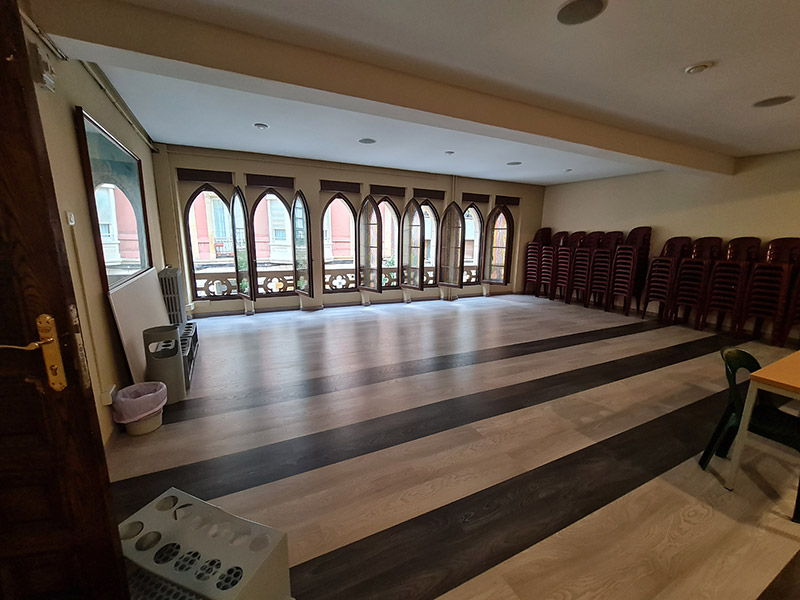Con la idea de mantener la esencia de lo antiguo dándole un cambio saneando todos los espacios con materiales de gran calidad una vez mas la iluminación crea un ambiente acojedor en un espacio tan grande.