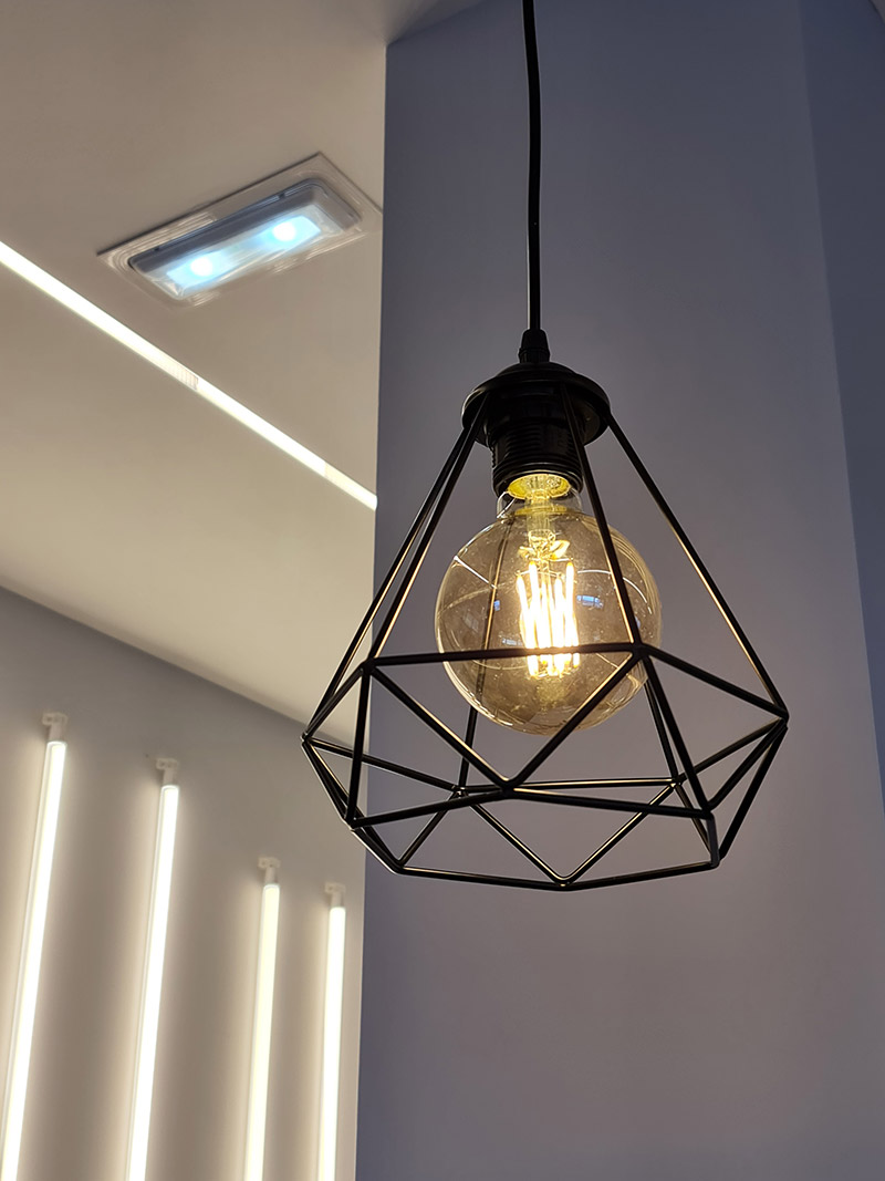 La iluminación combina lamparas colgantes con lineales de led cubriendo las zonas y estas en varias direcciones. Un cambio radiacal que sin duda marca la diferencia.